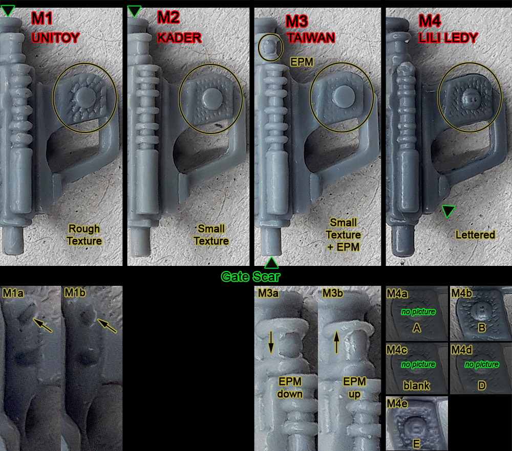 There are 4 main mould variations in existence. Subvariants do exist and may not all be documented. As a result of the fact that these were shot on a sprue tree in higher numbers the subvariants may vary heavily depending on the steel mould used.