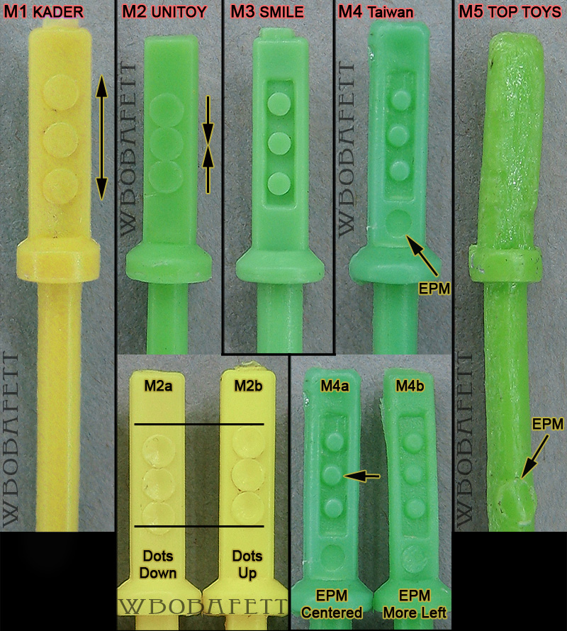 M2 was produced by UNITOY in Hong Kong. Cutting the gate to the top of the hilt from this specific saber often lead to cutting parts of the hilt by accident in this factory. As example see the saber to the far right. The following colours are known: