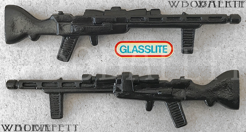 This rifle is one out of two moulds that was produced by Elektrospółdzielnia (EVANPLAST) for an unnamed line in Poland. The mould was used in the 80s, 90s and 2000s (1985-2003). These were packed in baggies probably stapled onto cardbacks and sold as accessory sets. They are nowadays mostly paired with the figures that came from the same factory in the so called “Polish 1st, 2nd and 3rd Gen” lines. All those weapons came in a huge variety of colours over the years. Here is one example: