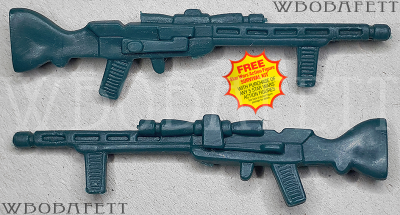 This rifle was produced by SB PRODUCTS for the “UZAY Savaşçıları” line in Turkey. The mould was only used in the late 80s and came with Imperial Stormtrooper “İmparatorluğun Askeri” (black and blue rifle) and “Blue Stars” (white rifle):