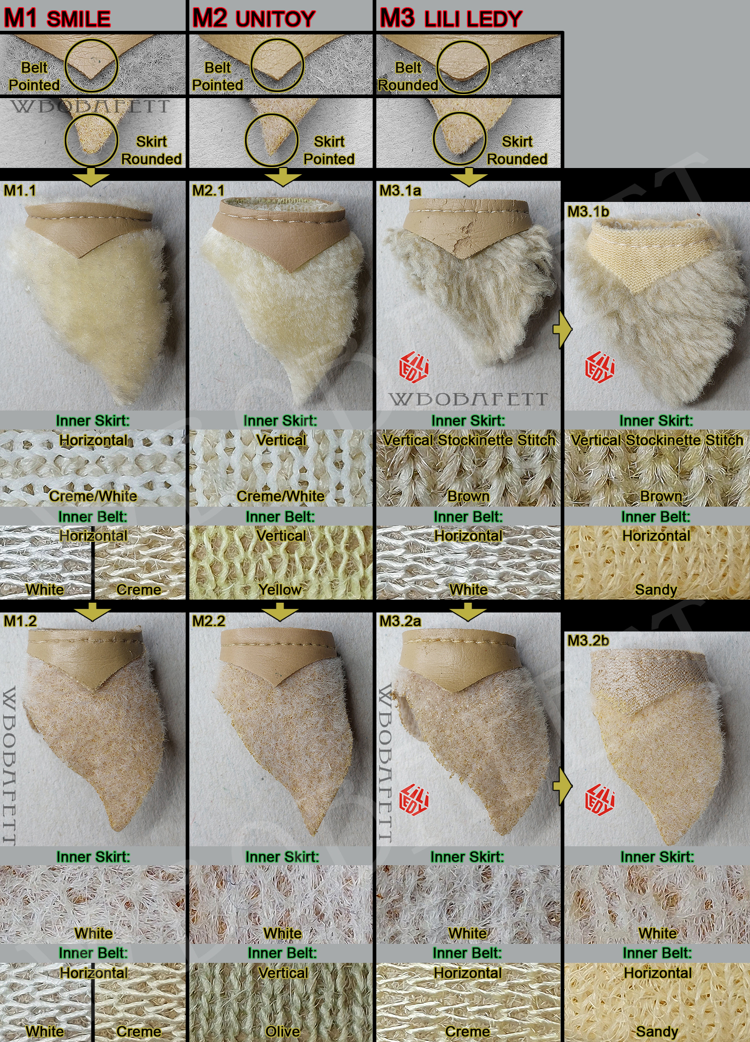There are three main skirt variations: M1 used by SMILE in Hong Kong, M2 which was used by UNITOY in Hong Kong and M3 which was used by Lili Ledy in Mexico. The main differences are in the shape and the materials used. All three versions came as fluffy or flat skirt. M1 used a pointed cut belt with the rounded skirt tip. Both fabrics (belt and skirt) were used horizontally. M2 used a pointed cut belt with an also pointed skirt tip. Both fabrics (belt and skirt) were used vertically. In addition their inner belt material being yellow or green stands really out. M3 skirts have a rounded belt with the skirt tip also being rounded. The fluffy skirts are made out of a very thick linen-like material in stockinette stitch. Both, the fluffy and the flat version, came also with a “non leathery” belt. Those so called fabric belts (M3.1b and M3.2b) originally had a paint or vinyl layer with a fabric backing which over the years turned brittle and delaminated, exposing the fabric backing.
