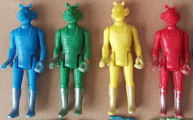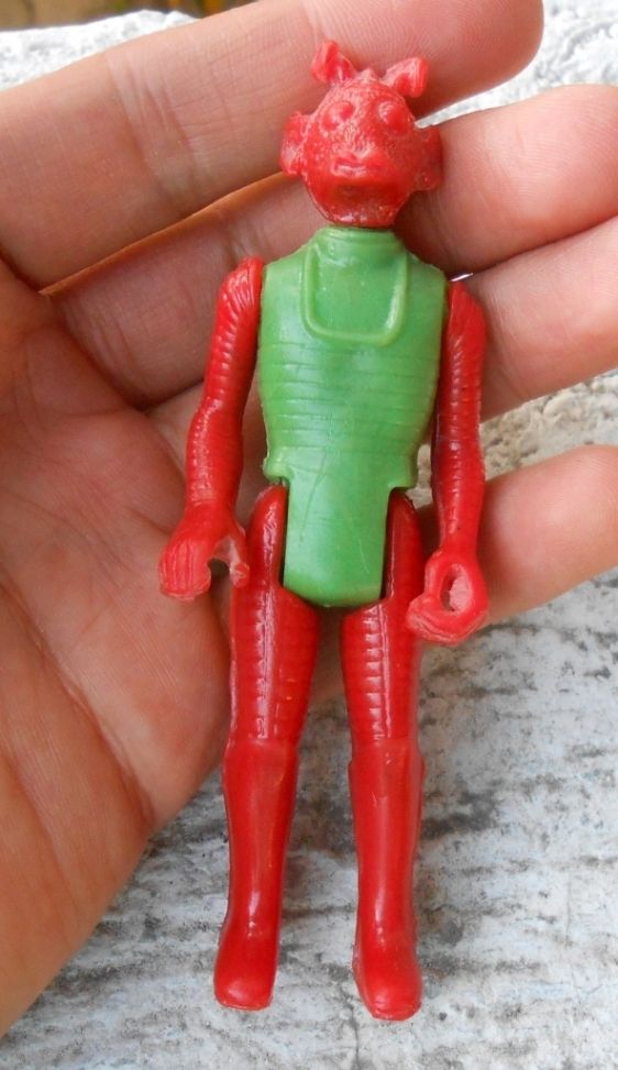 The fully articulated bootleg (F/A 3) Greedo figures shown above were made in Mexico in the 80s and do have 5 articulation points. They are similar produced compared to their licensed counterparts. Limbs and heads are made with pivot connectors and the torso halves are pressed together with limbs inserted. They are not welded together so they can be opened carefully. Both, the toros and the limbs, are made out of a hard and brittle plastic.