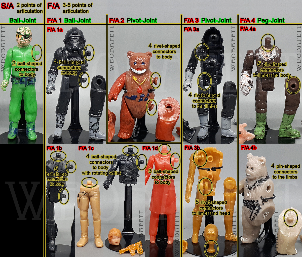 The pivot-joints can vary: Sometimes the joints are mounted to the torso (F/A2) and rubber-like limbs are pressed onto them and sometimes those are more produced like Kenner figures with a split up torso and pivot-joints to the limbs (F/A3).