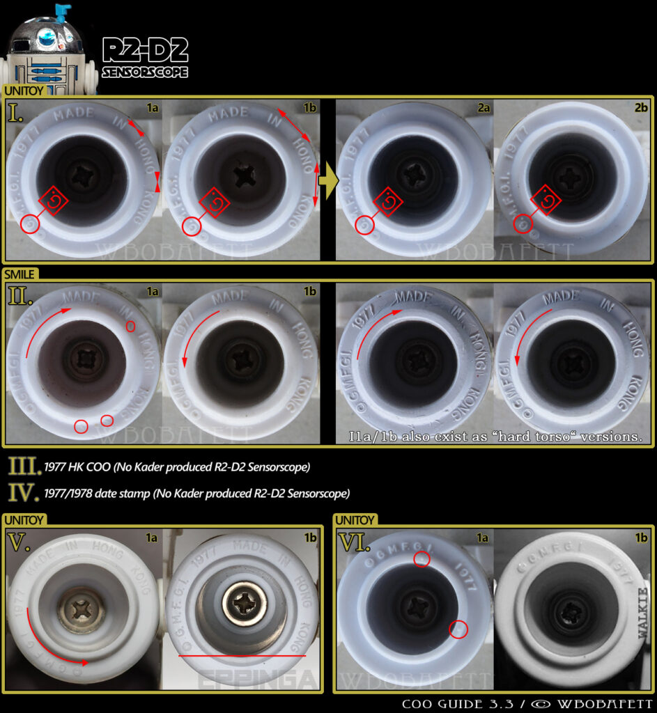 UNITOY production continued unchanged from their solid dome figure with mould families 1 & 5 to produce their Sensorscope torsos. Unitoy reverts from mid-blue, back to the dark-blue leg paint of the original 12bk solid dome figure. The sticker in this era is reworked, most noticeably now featuring a smaller wedge design. In the 65bk Jedi era, the MIHK is removed leaving us with the No COO torso.