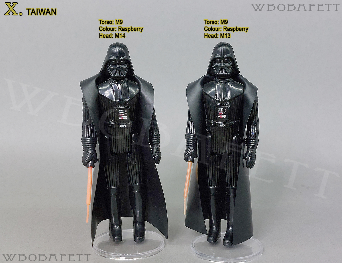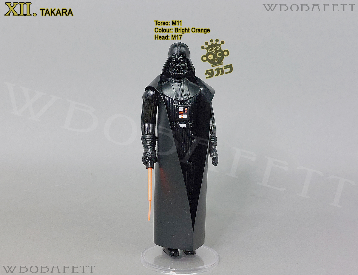 Instead of using Kenner tooling, TOP TOYS took a cast of another production figure to create a completely new tool. Top Toys figures were a licensed product, however the result is a poor quality figure with many imperfections including bad articulation and excess flashing. Regarding the M8 torso it seems most likely that a Lili Ledy figure was used for the cast. TOP TOYS paired the Vaders with M10 sabers and M14 capes.