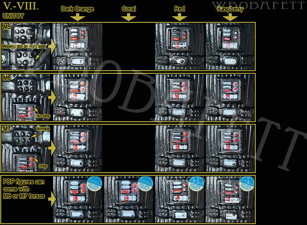 Fam VIII No COO came with M6 or M7 torso sculpt. Both torso moulds came from UNITOY in Hong Kong. The COO was altered by PBP with the so called “scarred out” COO. Both torso moulds were paired with M8 or M9 head sculpts. The torso’s chest colours are dark orange, coral, red and raspberry. These colours may be found on all torso-head sculpt combinations. PBP figures are usually paired with M5 and M6 sabers.