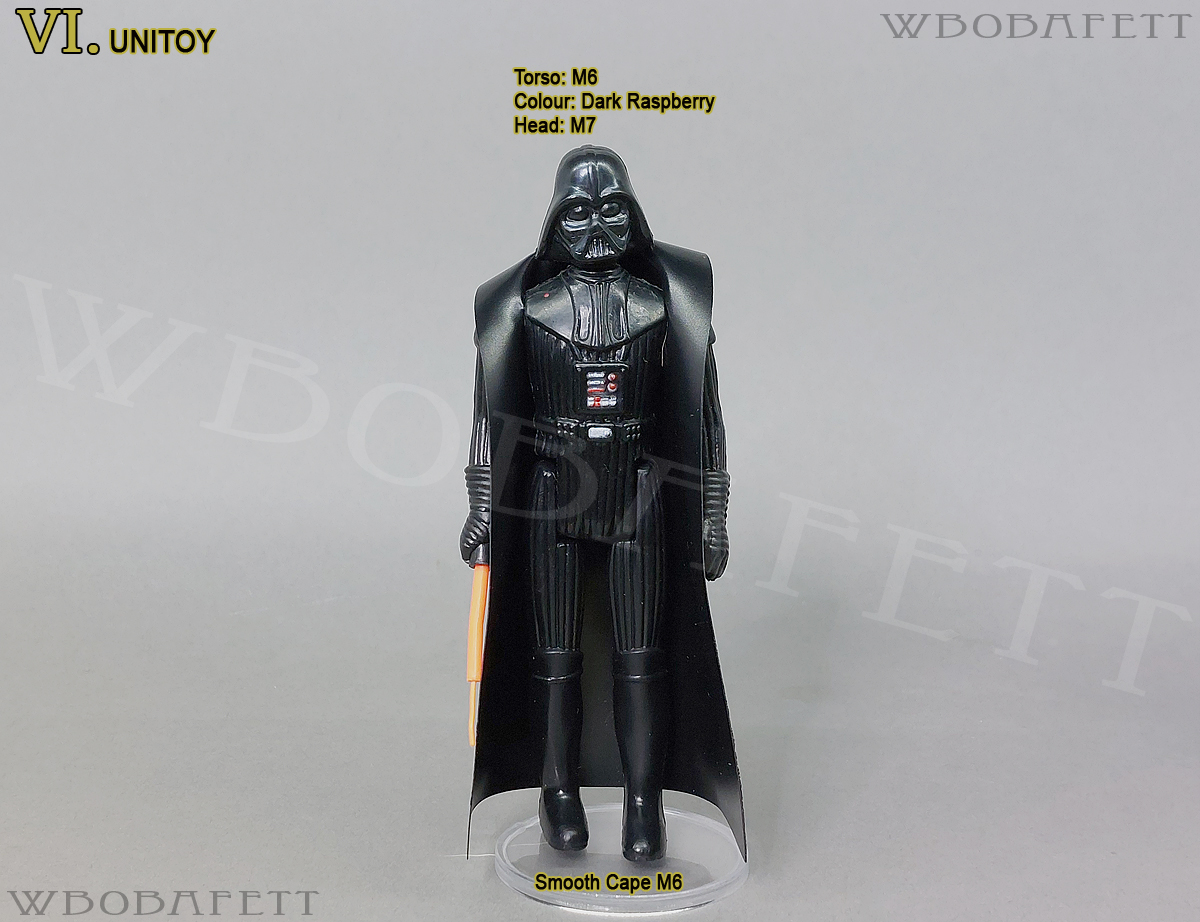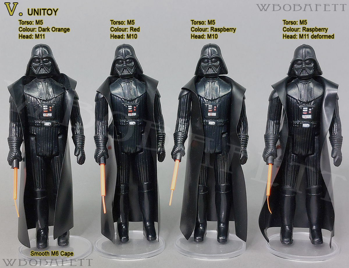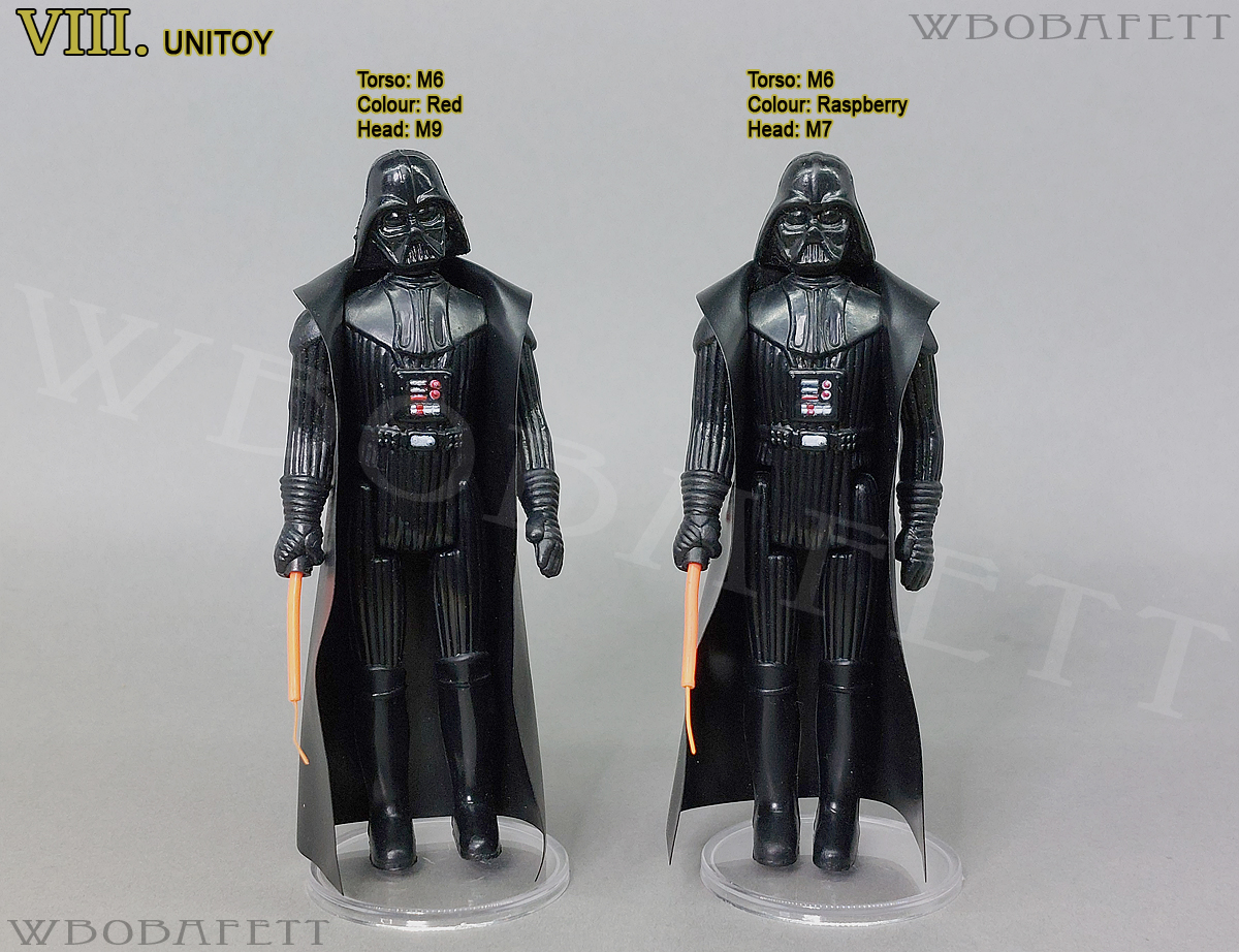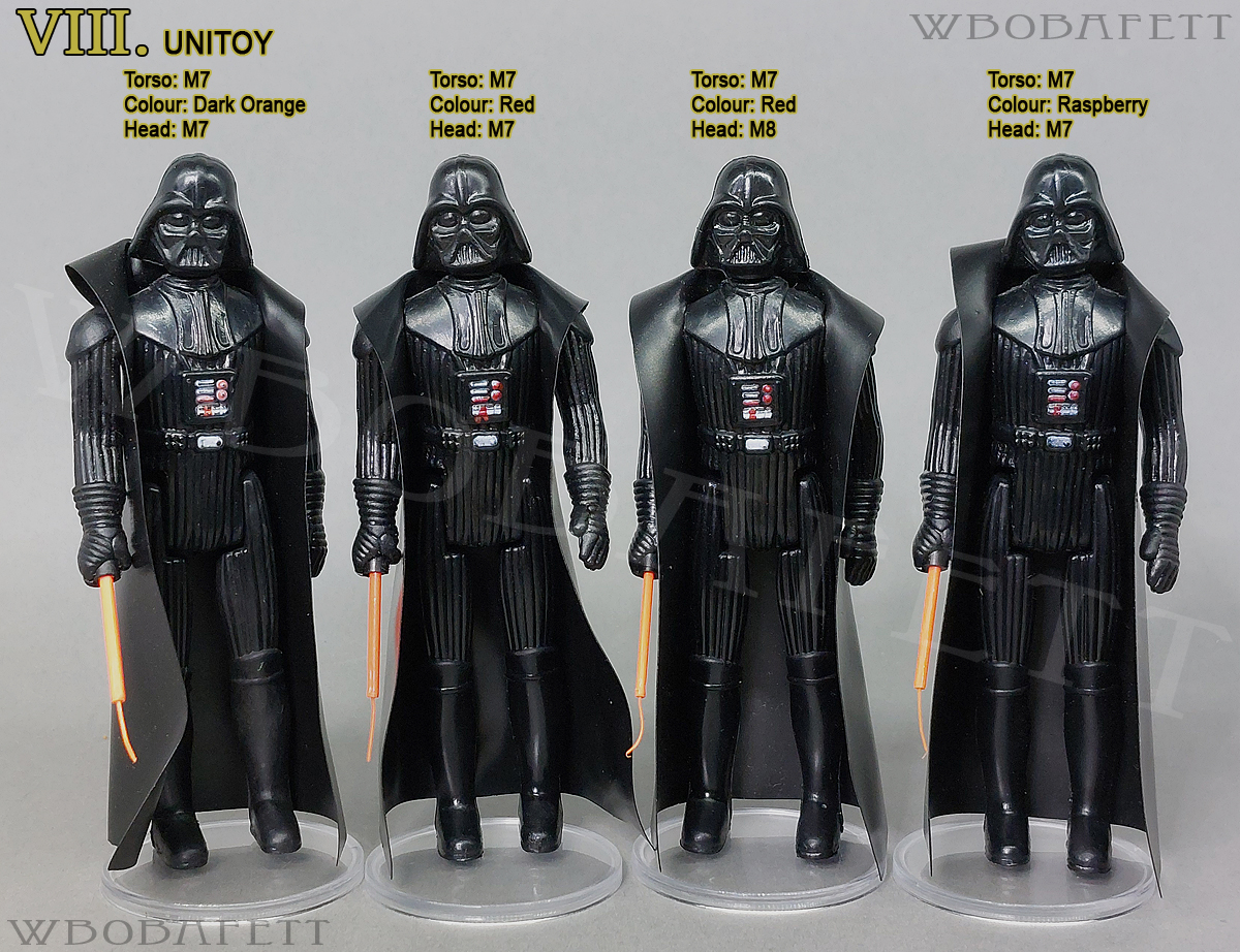 Above you can see different Darth Vader figures from Fam VIII made by UNITOY in Hong Kong. They are sorted after the two different torso moulds M6 and M7.