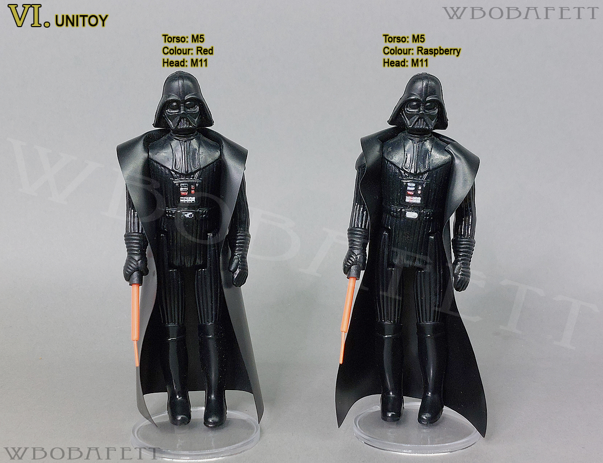 Above you can see different Darth Vader figures from Fam VI made by UNITOY in Hong Kong. They are sorted after the two different torso moulds M5 and M6.