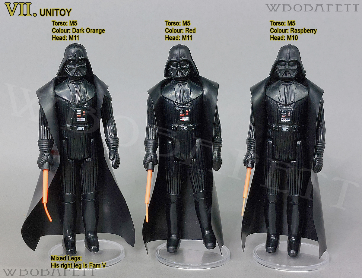 Above you can see different Darth Vader figures from Fam VII made by UNITOY in Hong Kong. They are sorted after the two different torso moulds M5 and M6.