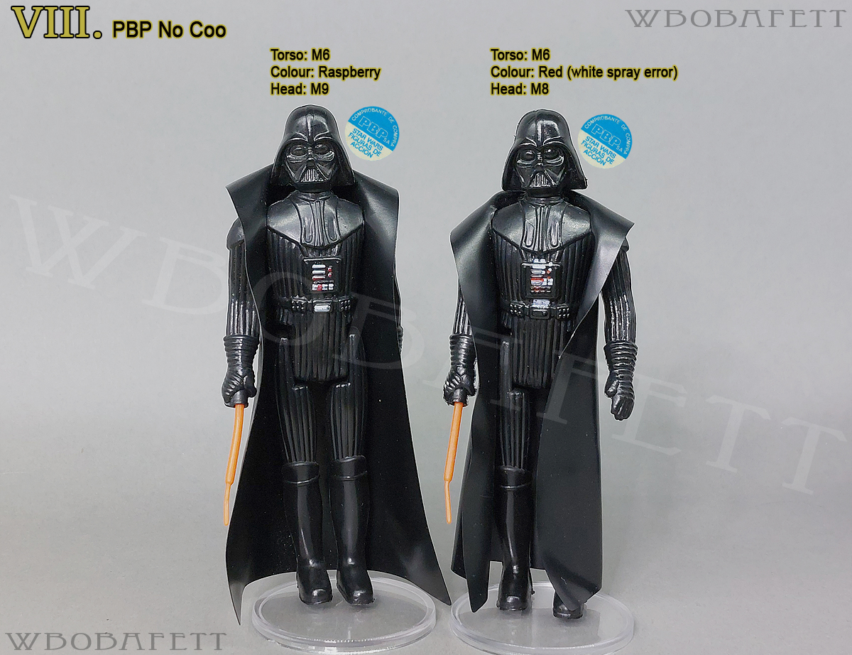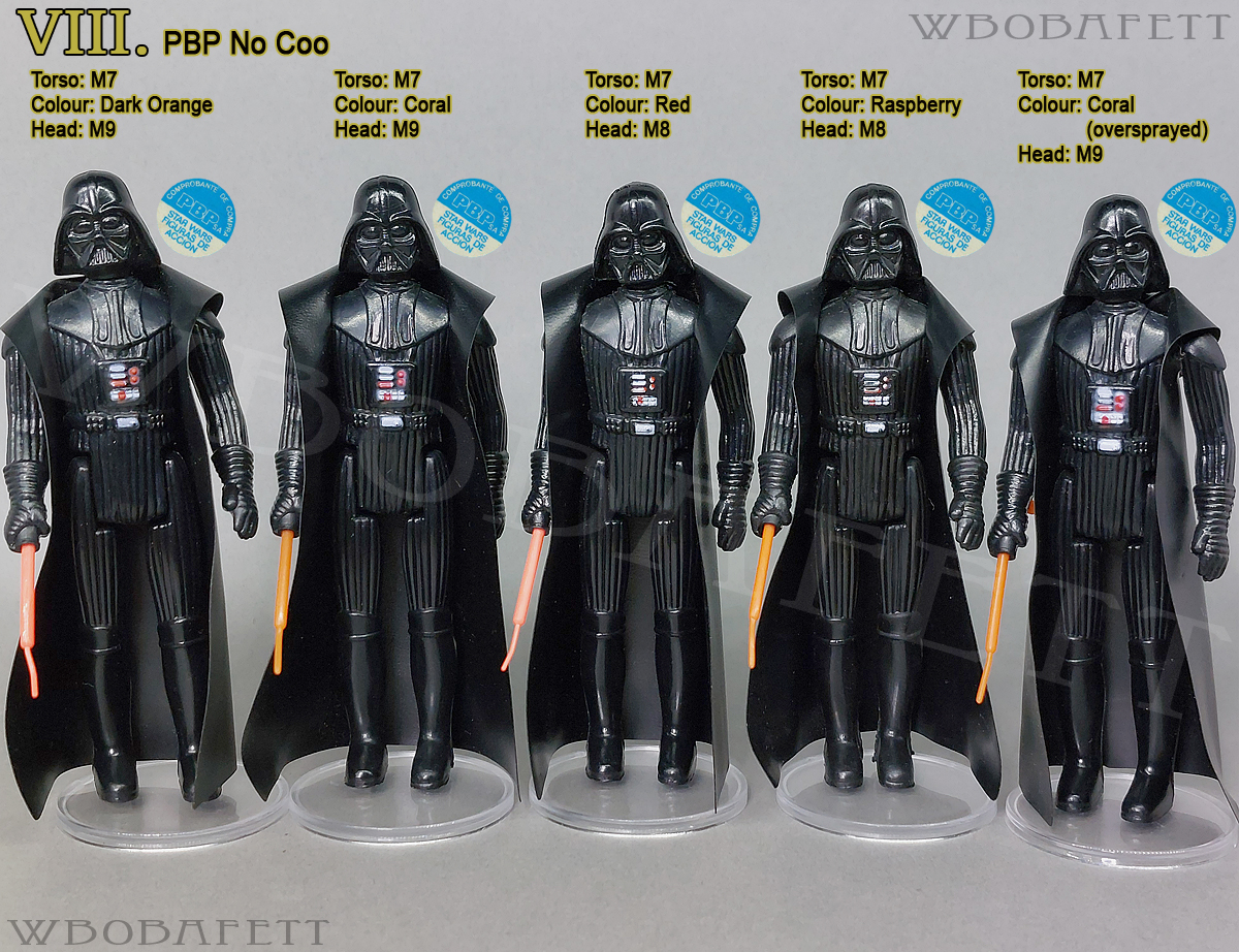 Above you can see different Darth Vader figures from Fam VIII with No COO made by PBP in Spain. They are sorted after the two different torso moulds M6 and M7.