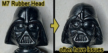 At UNITOY, different head molds were also sometimes mixed during production. Family V is consistent and used only M10 and M11 heads. Familiy VI and VII used mainly M10 and M11 heads but M7 heads can be found with those as well. Family VIII used M7, M8 and M9 heads. M7 is probably existing in 2 mould versions, but these are very hard to determine, because this rubbery produced head is prone to deformation and poor/short shots.