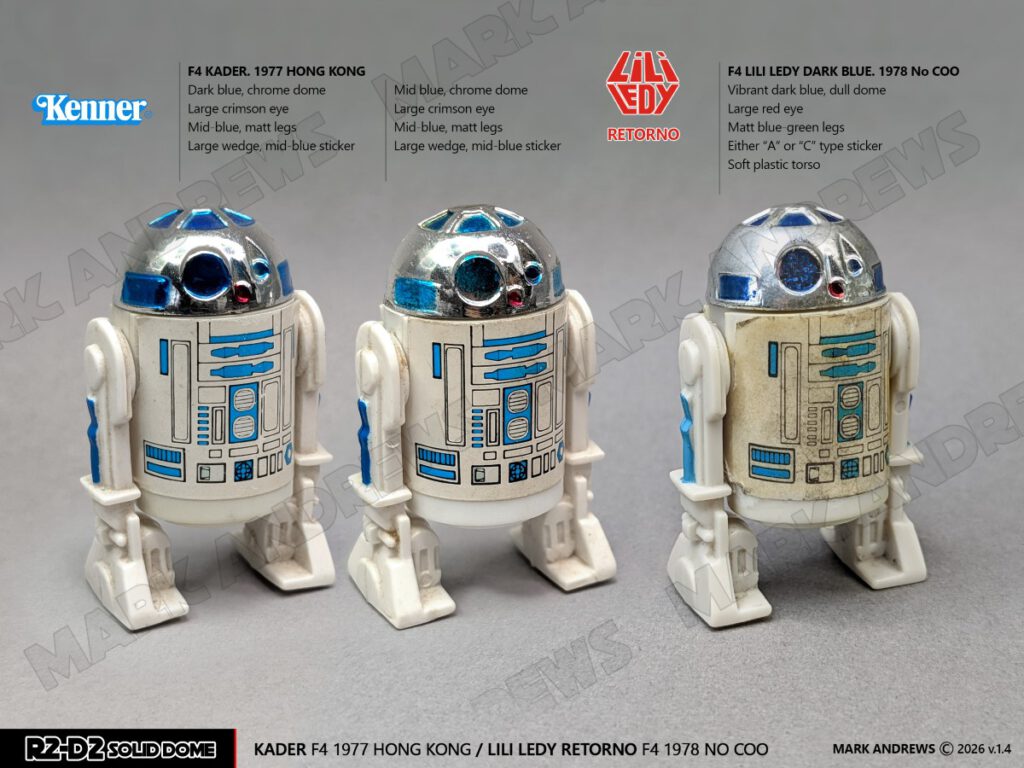 KADER was arguably the largest producer of solid dome R2-D2s. Their earliest dark blue figure was commonly featured in “Early Bird” sets and 12bk era cardbacks. The Kenner directive applied here too and thus the mid-blue dome & leg figures started to appear in the 12bk era and remained their main version till the end of Kader R2 production on the 32bk card.